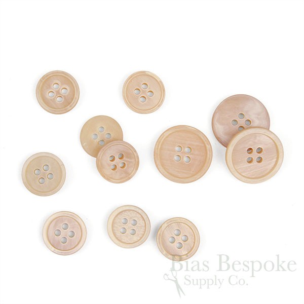 Subtly luminescent genuine horn buttons in a light pink-beige-tan color. Classy and gorgeous. Real horn is distinguished by natural variation in color and pattern. No two buttons look exactly the same. Made in Germany.