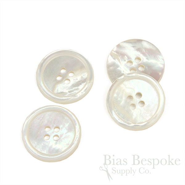 Buttons made from real Mother of Pearl shell in their natural shell color with the iridescent pink, green, blue, yellow, and purple glints that makes mother of pearl so exquisite. Made in Italy.