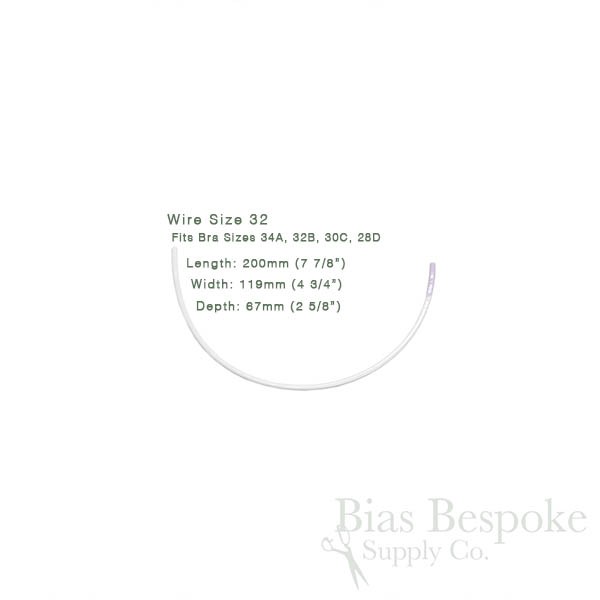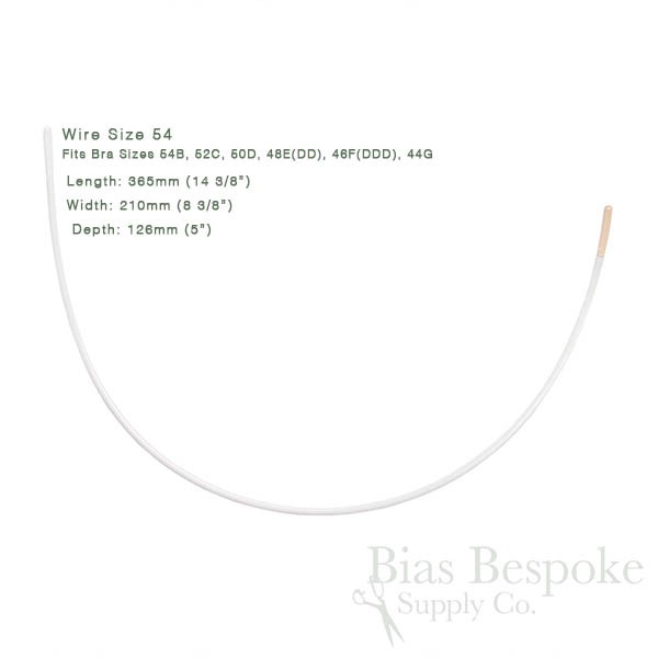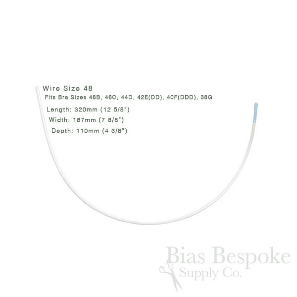 Strong and flexible spring steel bra underwires with a white plastic coating to soften the edges, and color coded tips to mark the front tip. These are longer than our BETTY underwires and are good for full cup bras. They come in 13 sizes from 30 to 54. The price is for one pair (for left and right sides).