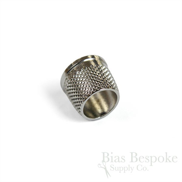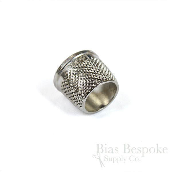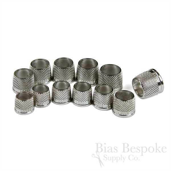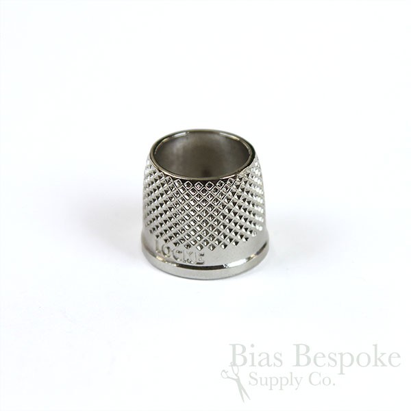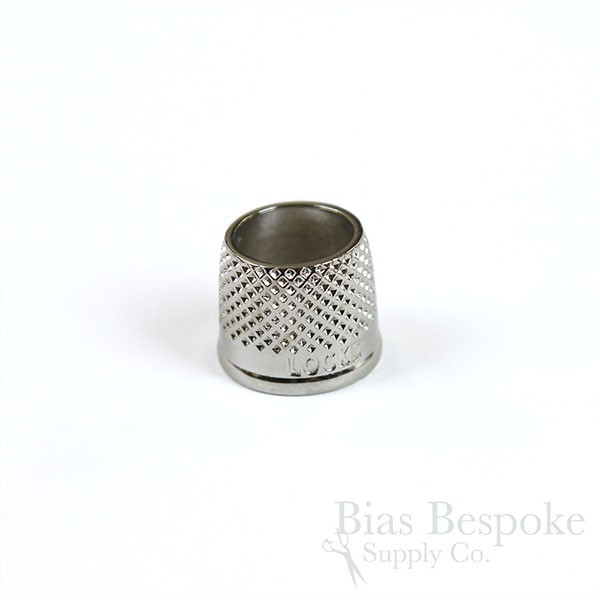 These tailor's thimbles are a true labor of love. Made by a tailoring student in New Zealand who found it hard to find good-quality tailor's thimbles in a good range of sizes, and then went about solving the problem not just for himself, but all tailors. He embarked on a multi-year journey casting his own thimbles and now offers them for sale. We are pleased to offer them to you! They're cast from bronze, and then these are nickel-coated. (We also sell them without the nickel plating, here.) For now, they're in 12 sizes from 13.5mm to 19mm.