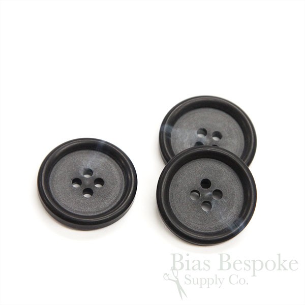 Strong plastic buttons in a classic shape with a double-matte center section and a matte rim. They're a blue black with dark blue flecks to mimic the look of buffalo horn. Made in Italy.