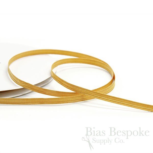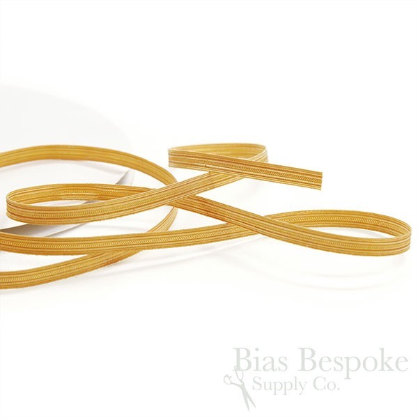 Narrow bullion trim made with real metal wire woven around thread. The feel is fairly stiff, but for garments where longevity and authenticity are paramount, this is a the best choice, as the metal will oxidize over time to an antique-looking patina. It's about 5/16" (7mm) wide, in bright gold and pale silver. Made in Pakistan.