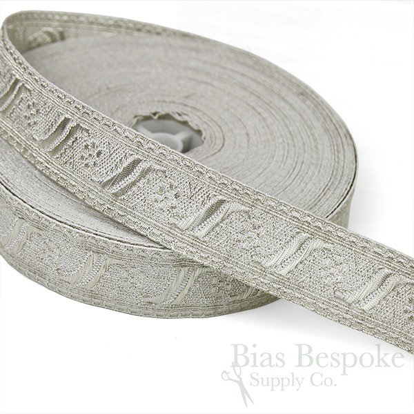 Military braid perfect for formal uniforms and military-style garments. It's made with elegant metallic color thread woven around a fiber core and shows a pattern of ribbons and flowers. About 1 1/4" (31-33mm) wide. Made in Pakistan.