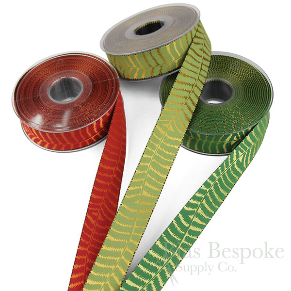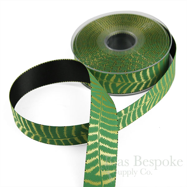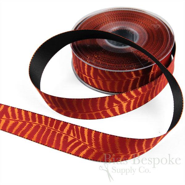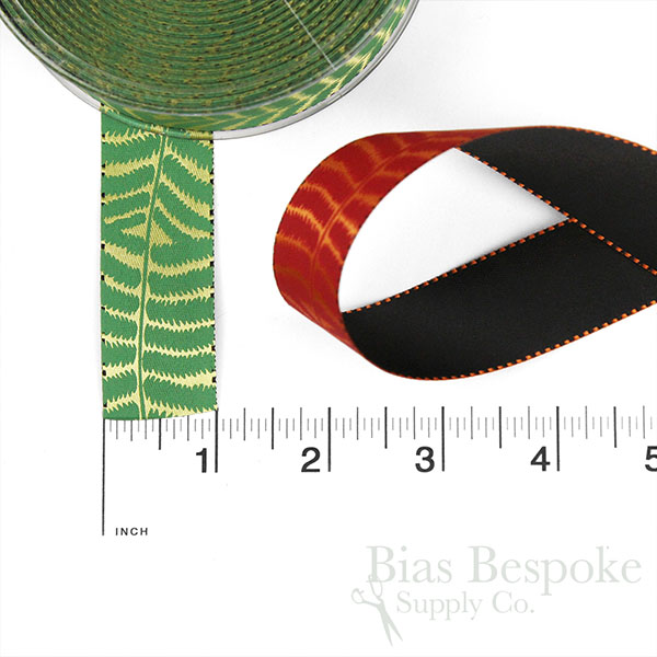 Double-faced, double-woven and painted satin ribbon. One side is primarily solid black and the other side is a different color - orange, gold, or pale green - with a continuous stem of fern leaves painted along the length. 1" (25mm) wide. We also have this in a 5/8" width.